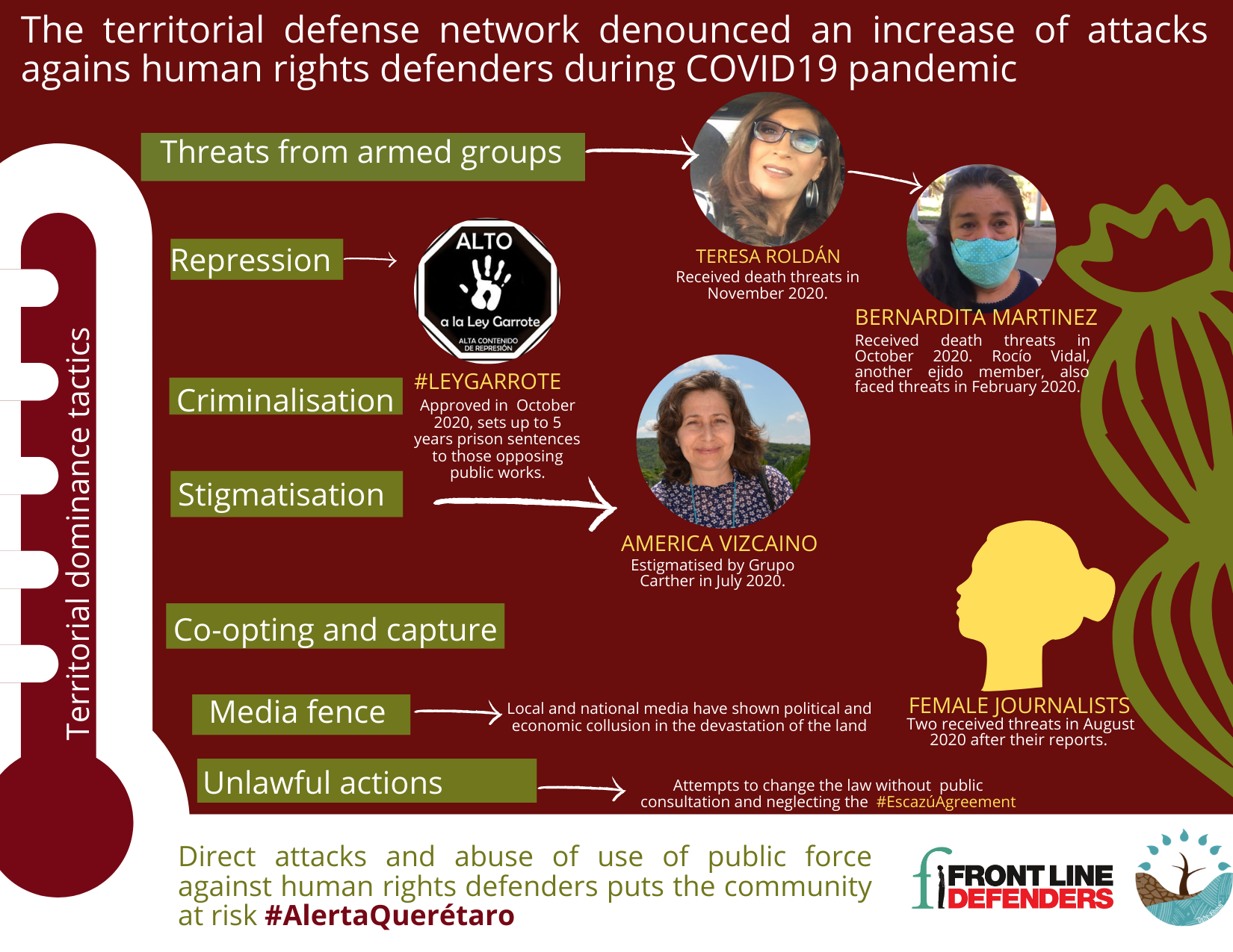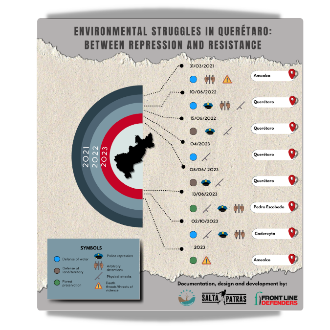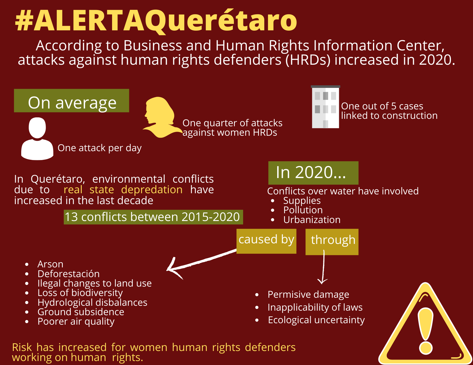 Since 2020, attacks against human rights defenders in Querétaro have drastically raised together with environmental and real state conflicts. Bajo Tierra A.C. and Front Line Defenders have produced the following inforgraphics to denounce this situation and demand protection for human rights defenders.